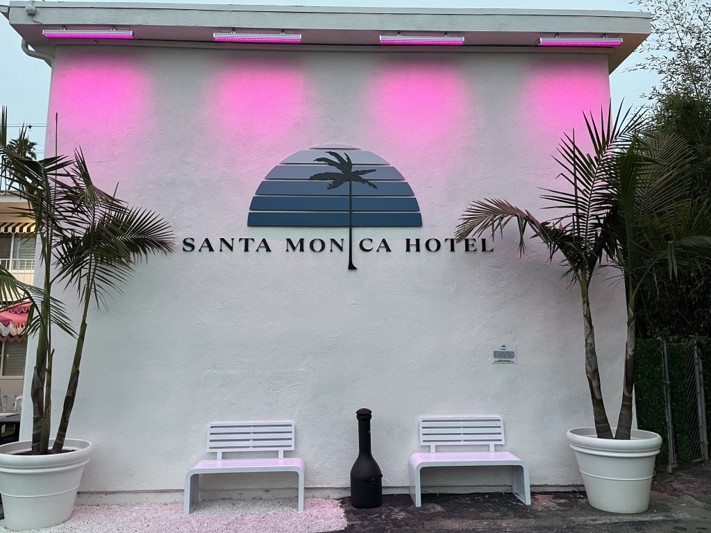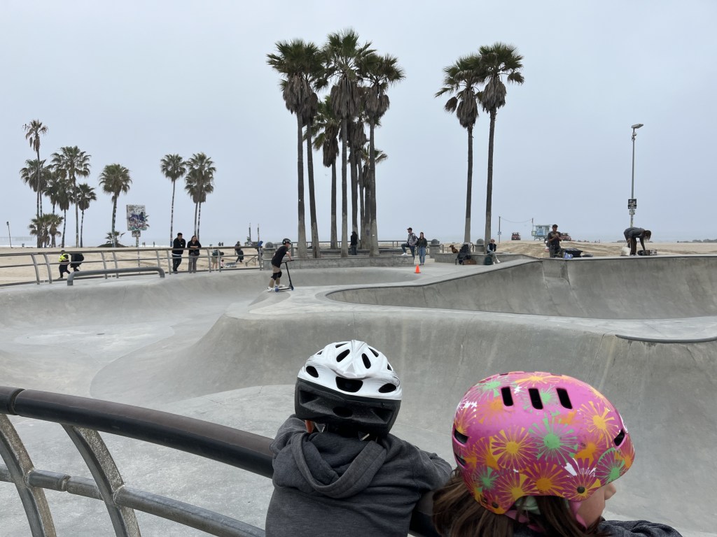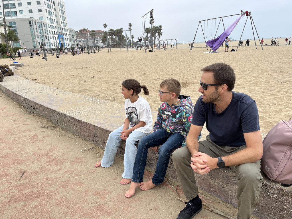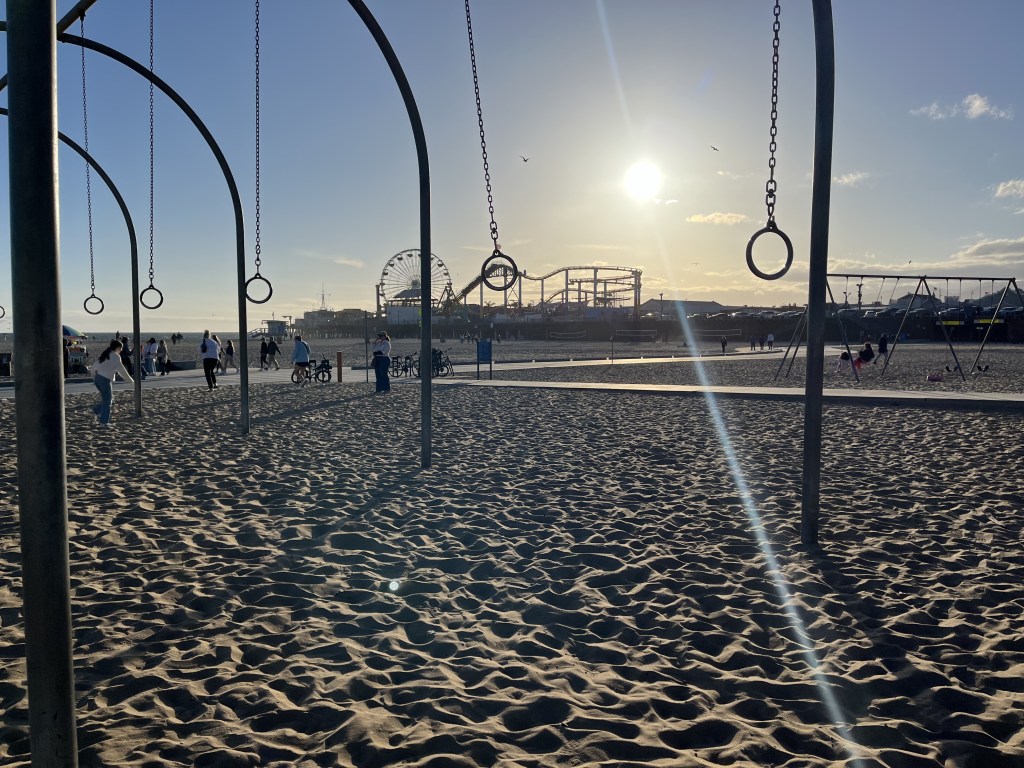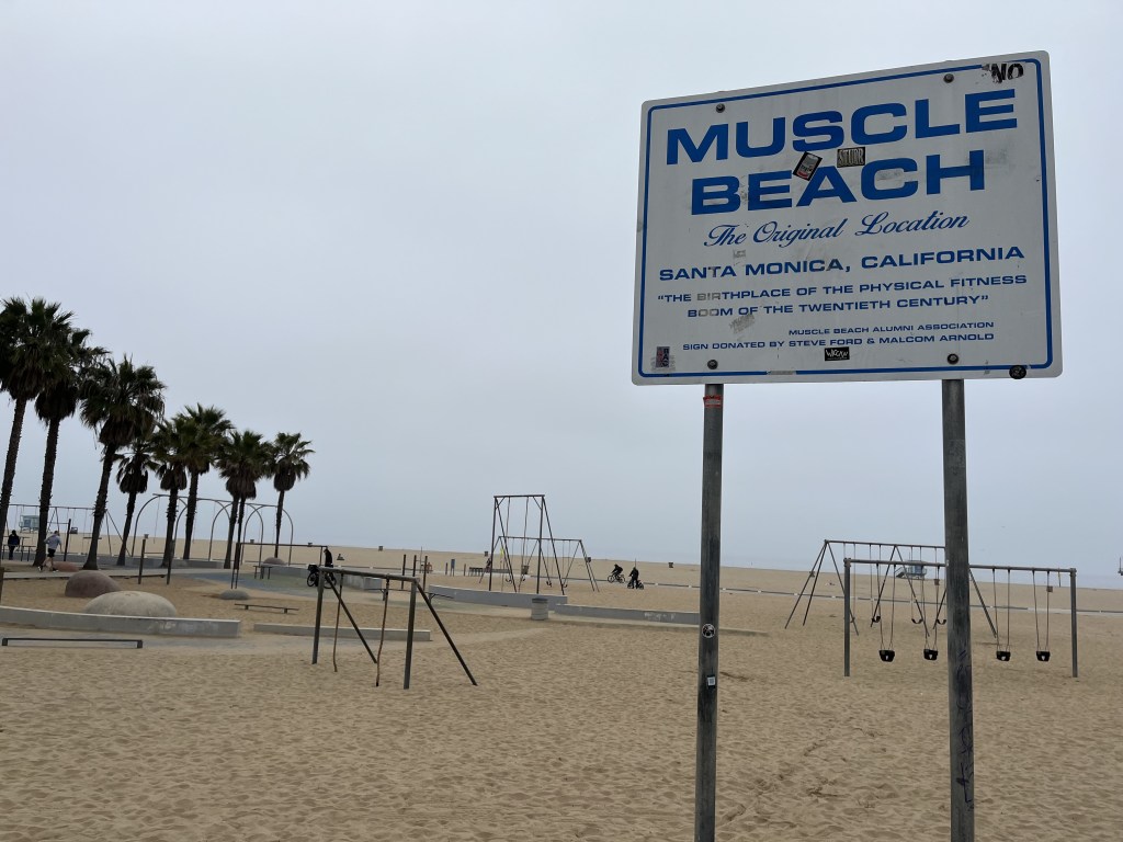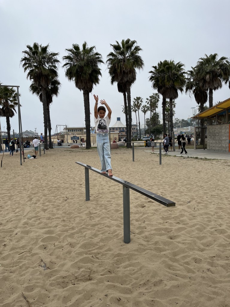 Après une première nuit dans un hôtel près de l’aéroport (excellente idée d’ailleurs, on va répéter!), nous nous sommes dirigés vers Santa Monica pour élire domicile au chic Santa Monica Hotel, qui est en fait un motel sur le boulevard Lincoln situé à 6 coins de rue de la plage. L’endroit est très bien entretenu avec un certain cachet pour un motel américain. En attendant que notre chambre soit prête, nous avons marché dans le secteur jusqu’à la plage. Margot a découvert Muscle Beach, son endroit rêvé où nous sommes retournés plusieurs fois pendant le séjour. Elle se fondait bien dans la masse d’athlètes californiens malgré son jeune âge.