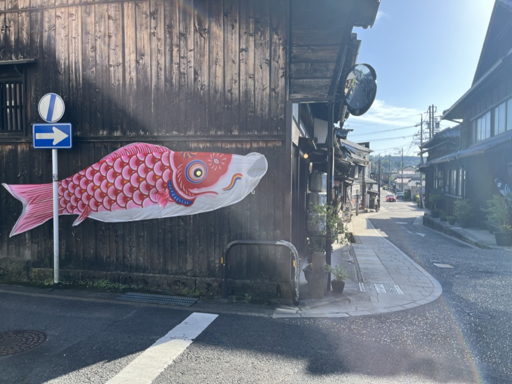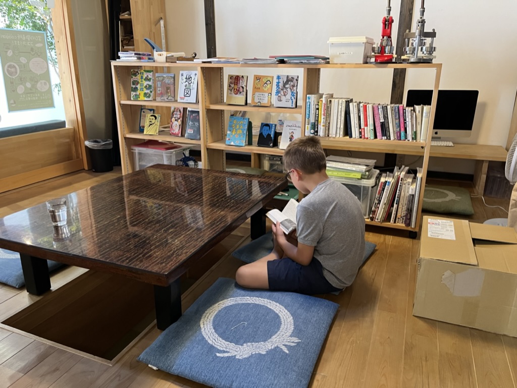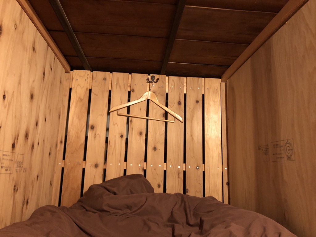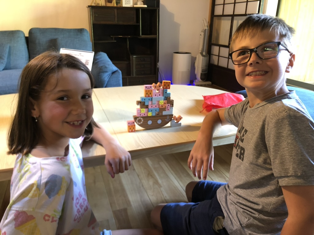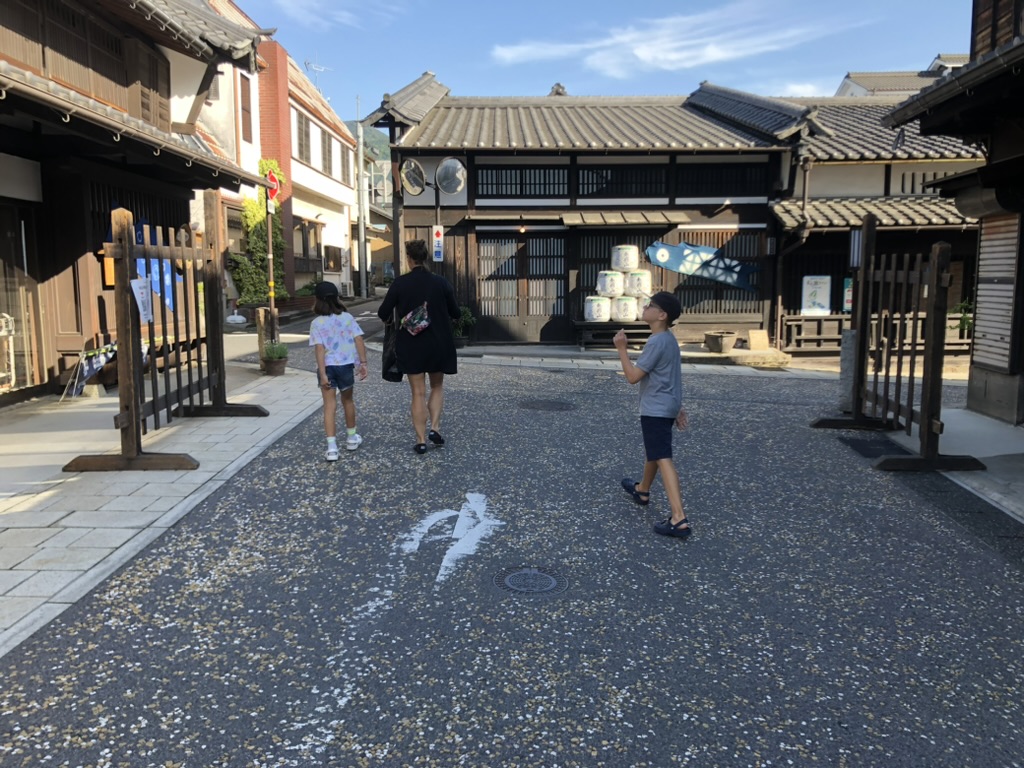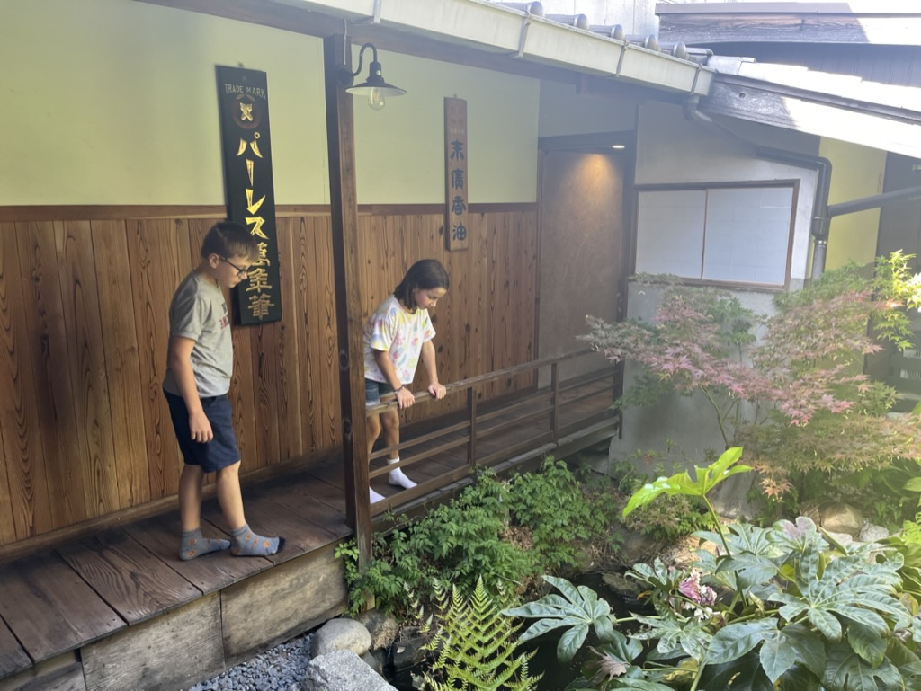 Après un 2e train, on arrive enfin à Nakatsugawa. Enfin, on respire le grand air de la région des Alpes japonaises. Il y a de l’espace sur les trottoirs, un bon vent frais et une belle rivière traverse la petite ville. On arrive à la fin d’un festival qui se tenait dans le vieux quartier où se trouve notre auberge. Nous avons la chance de dormir dans une maison centenaire, qui est réservée juste pour nous. Un grand salon avec vue sur un petit jardin intérieur et pour dormir, un mignon dortoir de quatre lits capsules en bois. Toute la famille adore l’endroit!
