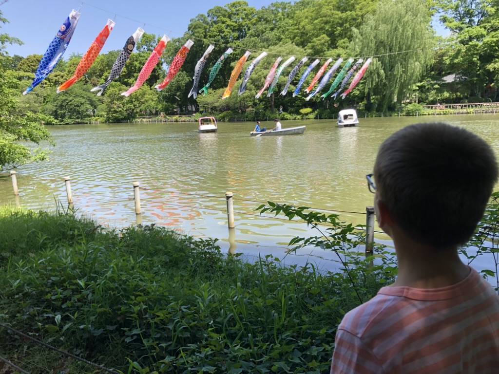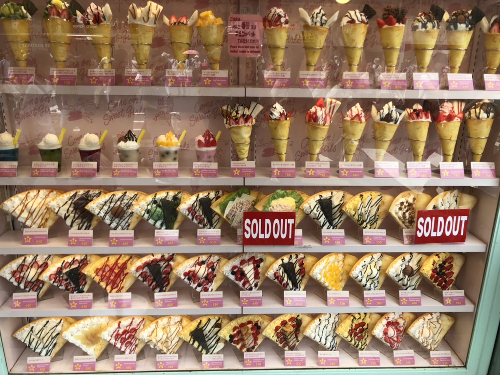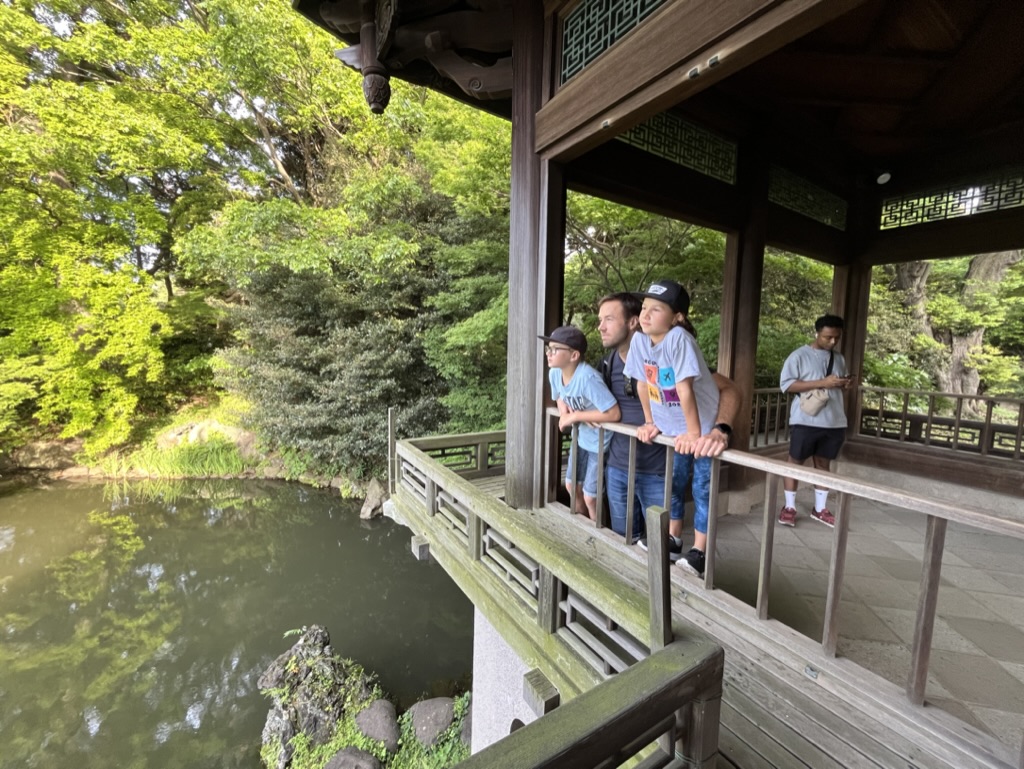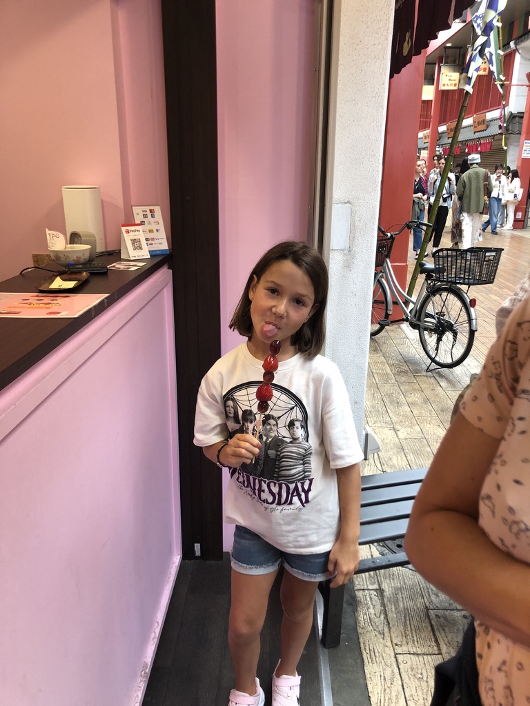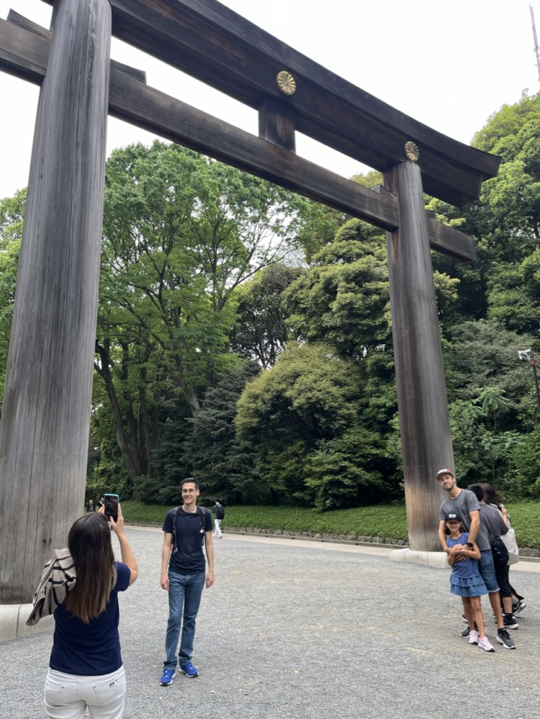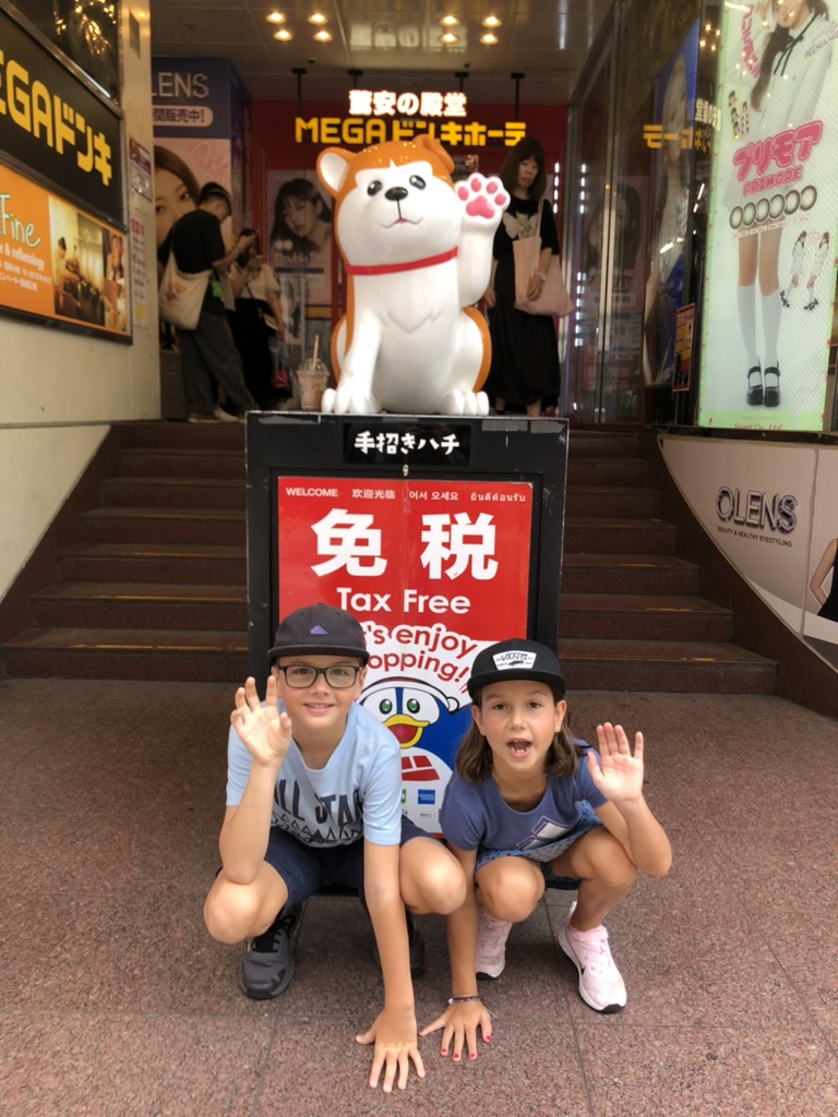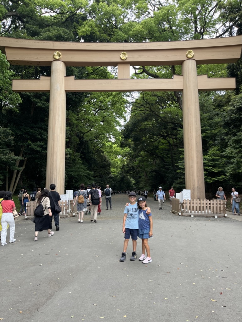 On se paye un dessert: crêpe roulée au gâteau et bulbe tea pour Margot. Les enfants découvrent les Cat Cafés, Dog Cafés et même Pig Cafés. Ils s’arrêtent devant toutes les vitrines pour admirer les petits animaux Kawaii (mignon en japonais). On conclut cette première journée en visitant le parc et le temple de Meiji-jingu.