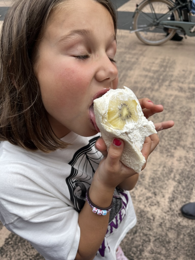 Comme Margot ne peut pas y goûter, on la (se) console avec des sandwichs aux fruits véganes. Le concept est assez simple: deux tranches de pain moelleux, fourrées de crème fouettée et fruit au choix. Simple, mais savoureux.