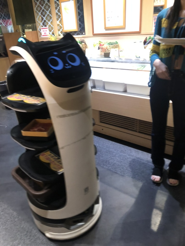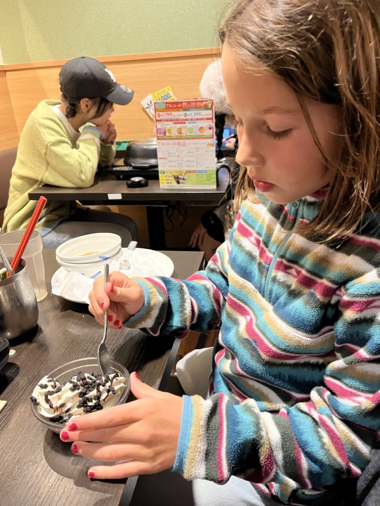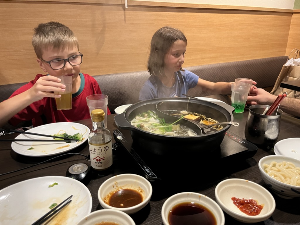 Pour dîner, on continue avec une valeur sûre, une ramen végane à un des nombreux food court. Ensuite, on rentre se reposer à l’appartement. Pour le souper, on sort vers Kichijoji pour un Shabu-shabu (fondue japonaise). Après une courte période d’adaptation, on comprend comment le tout fonctionne et on commence le régal. C’est un restaurant de type all you can eat. Nous avons 2 sortes de bouillon, on se sert nous-mêmes les légumes, tofu et condiments. On commande la viande sur un écran à notre table et ce sont des robots chats qui viennent nous servir à la table. Pour le dessert, Margot s’empiffre de crème glacée et de barbe à papa. On rentre à la maison bien rempli et avec des vêtements qui sentent le bouillon.
