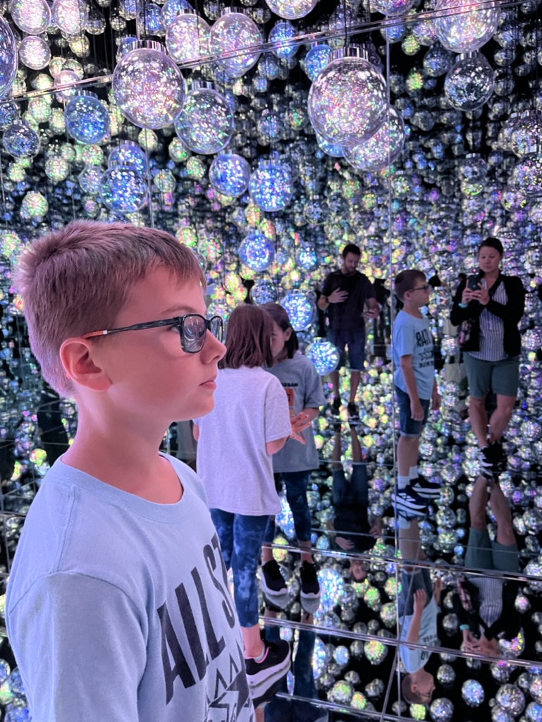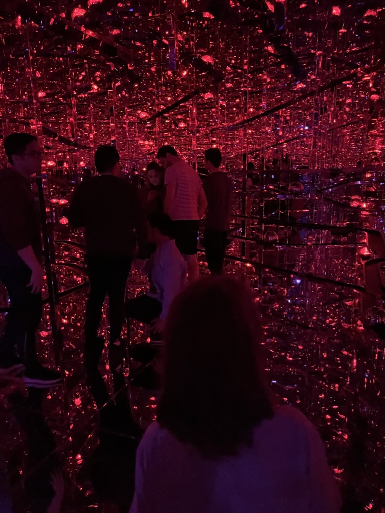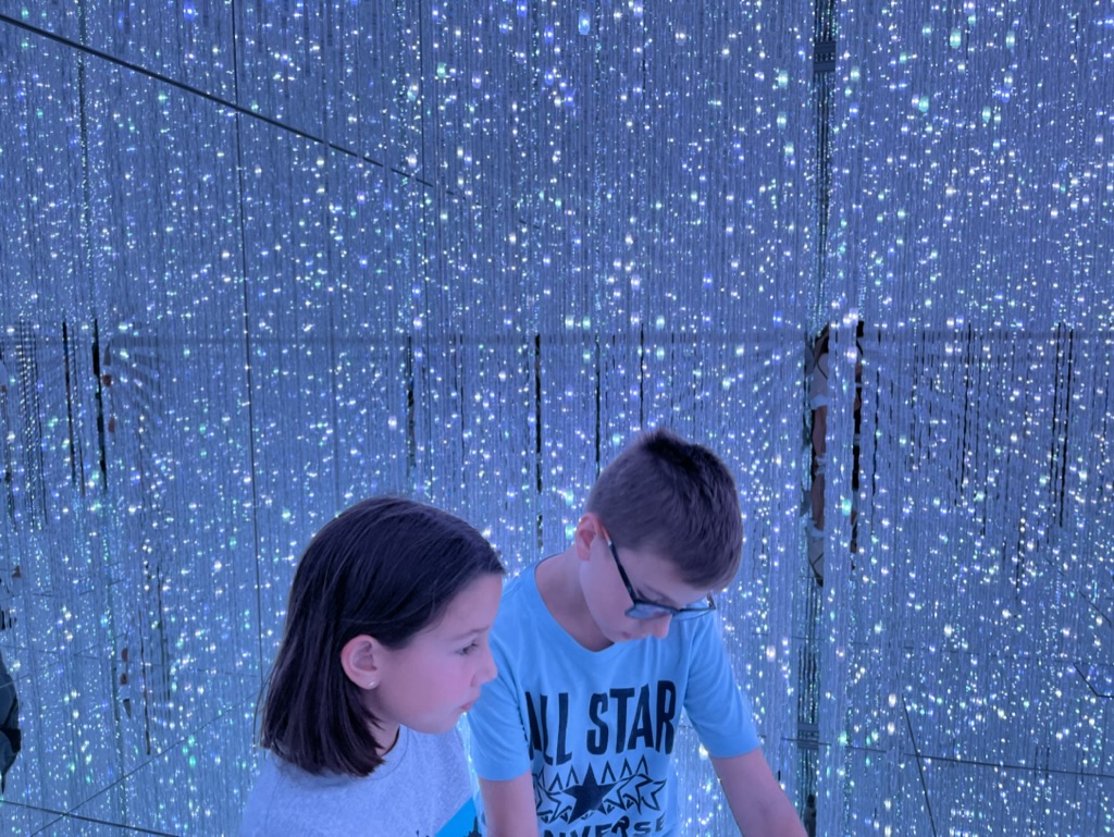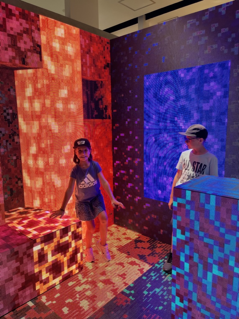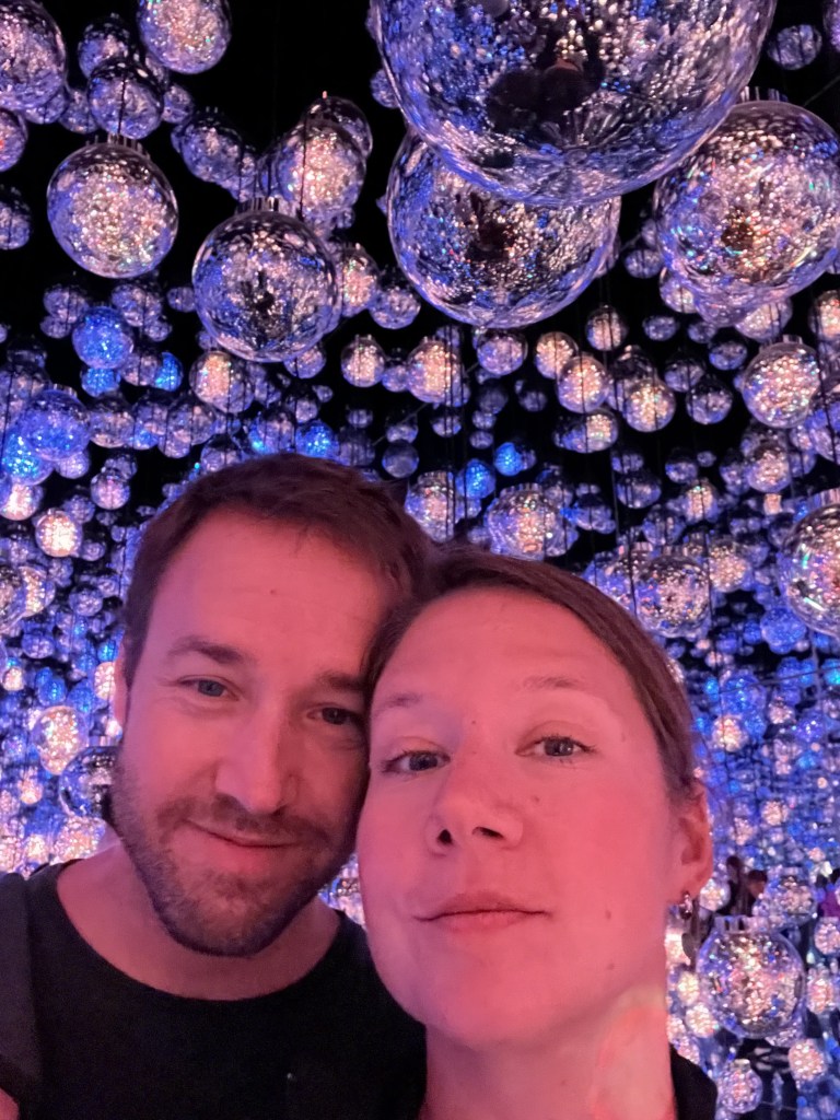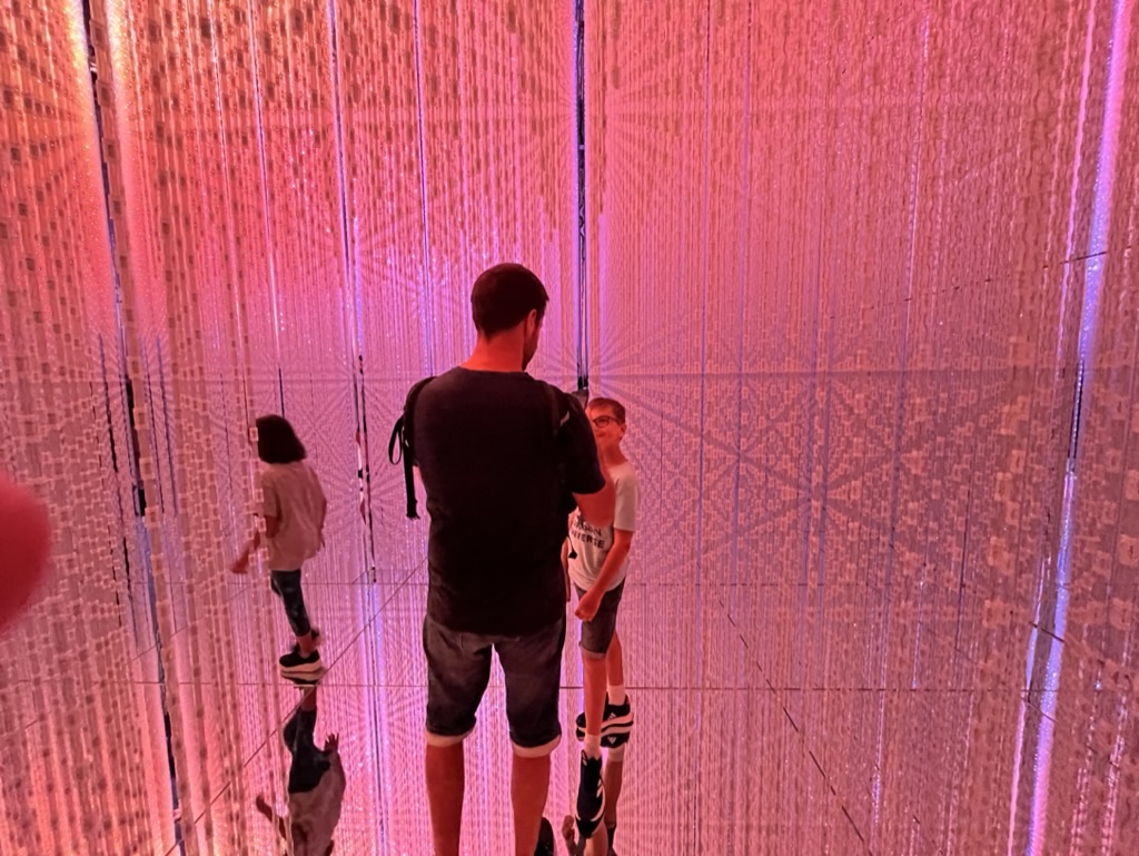 L’exposition est composée de plusieurs salles où on trouve des installations de jeux de lumières, parfois interactives. Il n’y a pas d’itinéraire précis, donc on prend plaisir à se perdre et découvrir des petits salles cachées ici et là. À notre sortie, nous avons trop faim, donc on quitte le quartier sans être monté à l’observatoire de la Mori Tower (nous y retournerons peut-être lors de nos derniers jours à Tokyo).