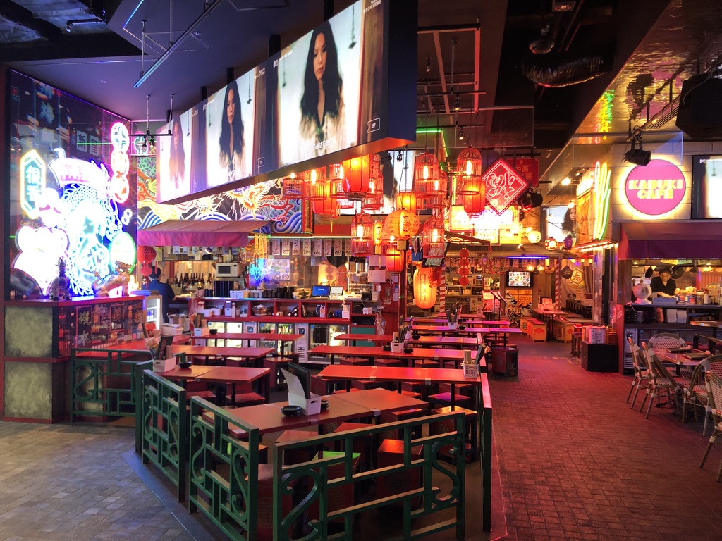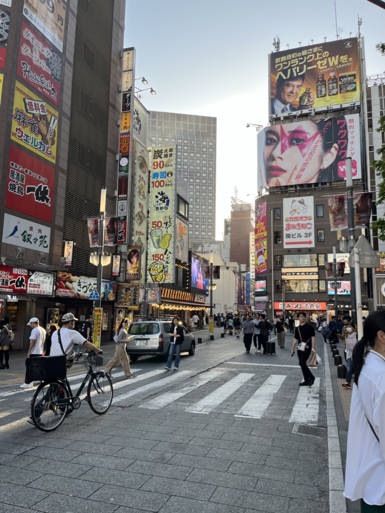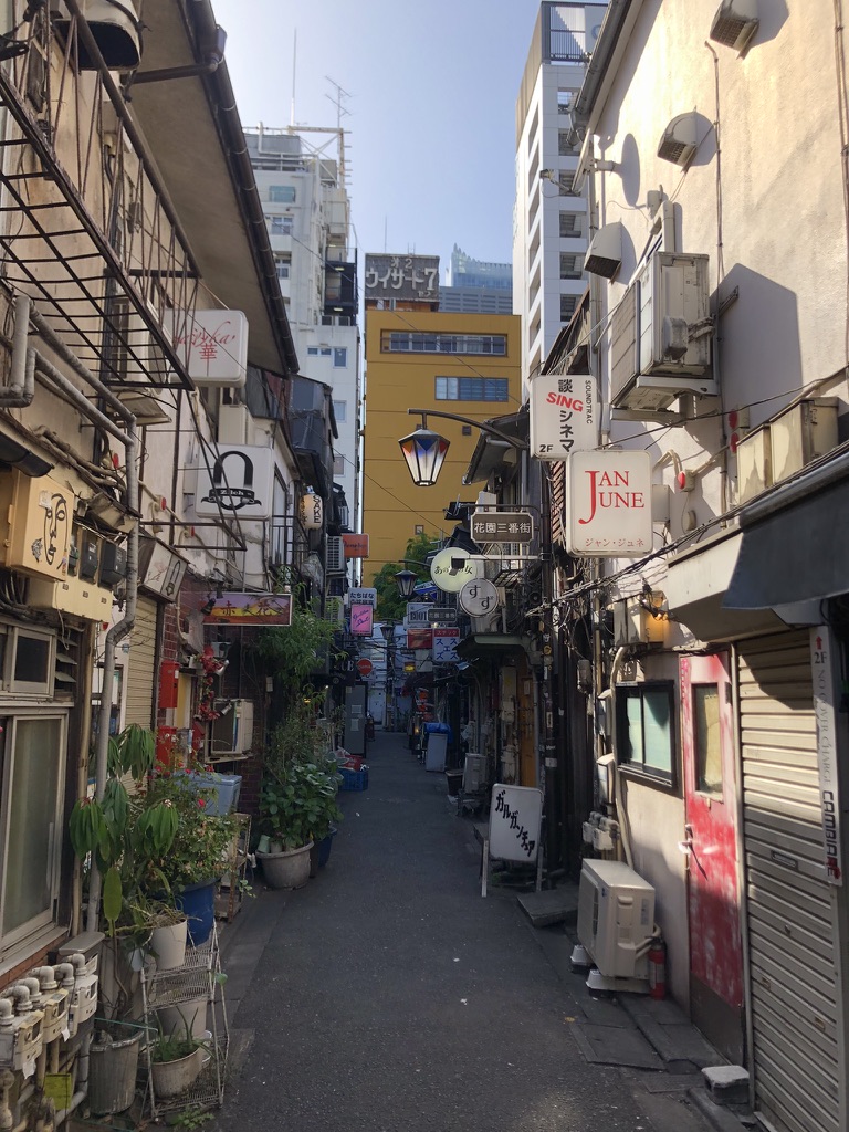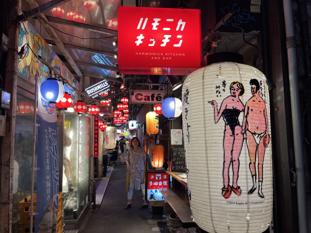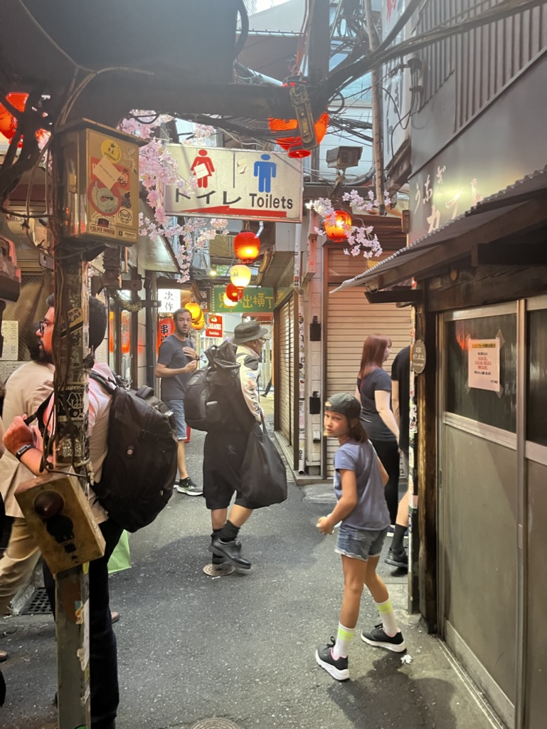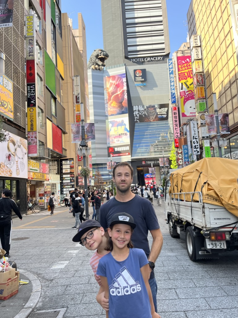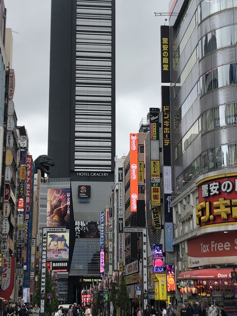 Ensuite, on se dirige vers Golden Gai, le quartier des petites brasseries, mais nous sommes tôt en journée et les ruelles sont désertes. On s’imagine facilement s’arrêter prendre une bière dans plusieurs de ces endroits uniques, mais ce sera pour un autre voyage (sans enfant peut-être). On se console tout de même avec une bière en terrasse en plein coeur de Shinjuku, sous les griffes de Godzilla. On en profite pour regarder la foule déambuler.