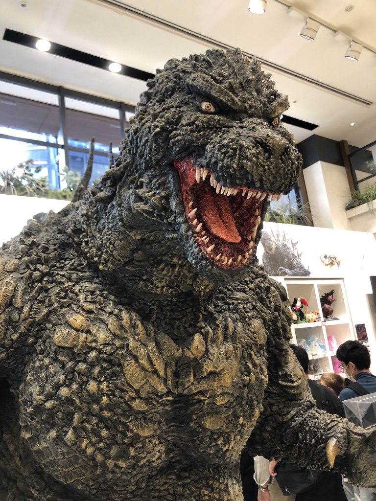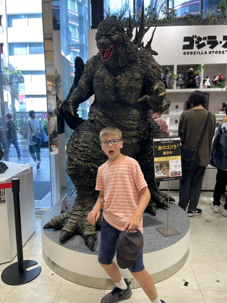 Cette fois le thème de la journée est définitivement Godzilla. On commence notre visite par un court arrêt à Yoyogi Broadway. On remonte tranquillement vers la station de Shinjuku avec un passage obligé au magasin Godzilla. Léo y passe plusieurs minutes à observer la statue, la maquette et toutes les figurines.