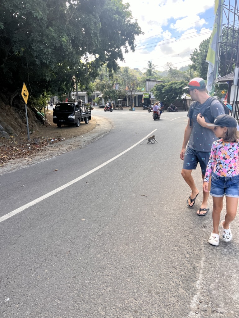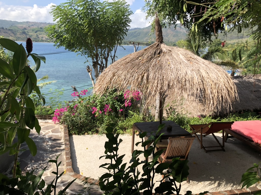 L’auberge est bâtie sur plusieurs niveaux à flanc de colline offrant une belle vue sur la petite baie avec villages de pêcheurs et Lombok au loin. Nous y sommes restés 4 nuits. Nous avons particulièrement apprécié le restaurant avec sa salle à manger les pieds dans le sable. La cuisine d’Alain et de sa femme indonésienne Ita était franchement délicieuse. Classiques français et indonésiens au menu. Julien a raffolé des crevettes Rendang et les enfants ont commandé plusieurs fois le plateau de toasts (tomates, olives, thon) et les classiques indonésiens (mie et nasi goreng).