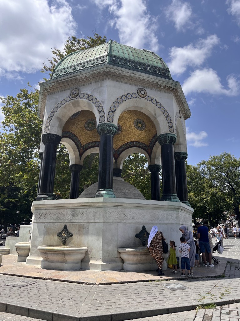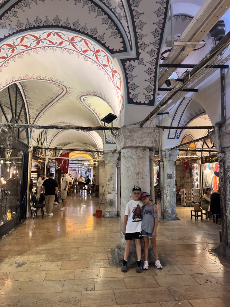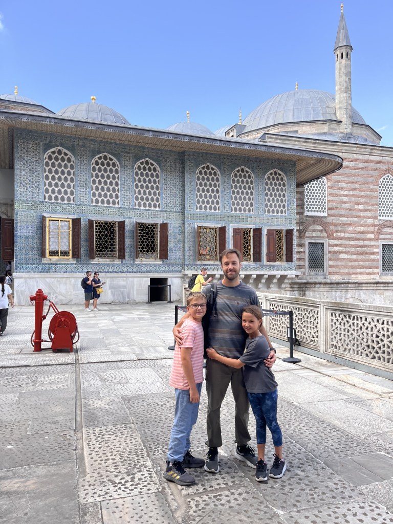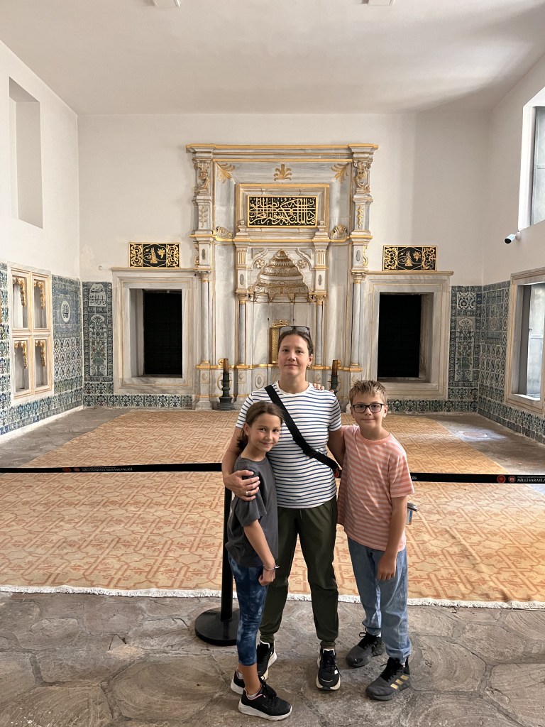 Le lendemain, muni de notre carte de transport IstanbulKart, on prend le bus et le tram vers le vieux quartier de Sultanahmet. Les transports en commun sont très efficaces, mais peu climatisés et il fait chaud. Température moyenne: 27-30 degrés, mais bien sec et avec du vent. On se dirige vers le palais Topkapi et le Harem. C’est beau, grand, et pas mal cher comme visite, mais ça vaut la peine. Les enfants aiment beaucoup se promener dans les jardins et visiter les pièces du palais, particulièrement la salle des armes. Ils y retournent deux fois.
