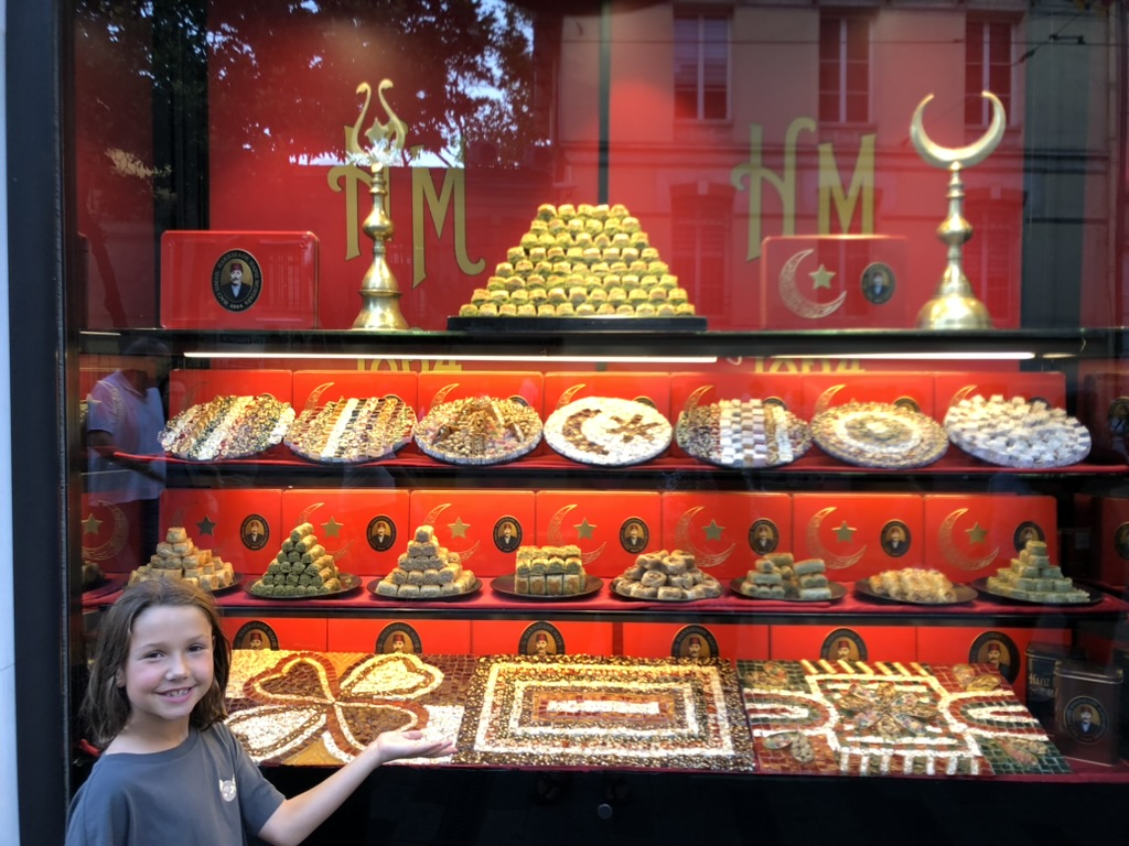 Après s’être reposé un peu à l’appart, on part déjeuner dans un café près de l’avenue Istiklal. Il est encore assez tôt alors on est presque seul et on constate rapidement que les gens sont pas mal moins sympathiques qu’en Indonésie. On marche sur la belle rue et rapidement les enfants se colle le nez dans une vitrine de Loukoum, le Turkish Delight. On en achète une boîte bien sûr. On continue notre marche jusqu’à la tour Galata et à l’escalier Camondo. On passe le reste de l’avant-midi à se chercher une épicerie pour se faire une base pour le déjeuner. Pas facile, y’a pas grande chose! On trouve finalement tout près de l’appart, pain turc, café (pas turc!), des fruits, céréales, etc. En soirée, un souper de viandes grillées et mezzes. C’est vraiment très bon la bouffe turque, toute la famille en raffole.
