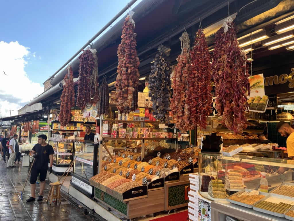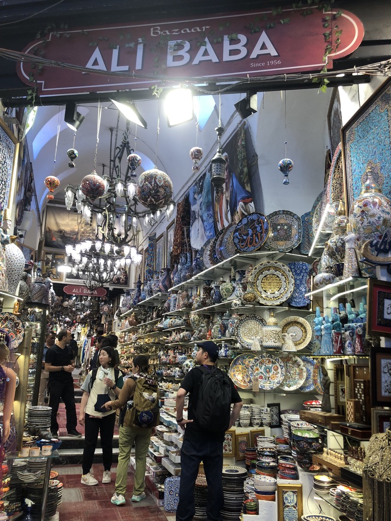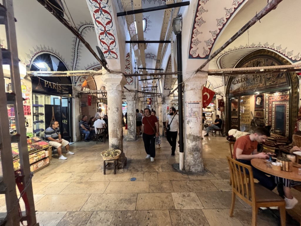 On retourne dans Sultanahmet pour visiter le Grand Bazar assez tôt le matin. On y entre vers 9h30 suivant les conseils du Lonely Planet qui mentionnait qu’une visite tôt le matin nous éviterait de se faire achaler par les vendeurs. En effet, à cette heure ils sont trop occupés à boire leur thé et à ouvrir leur boutique pour la journée. On s’assoit dans un café au centre du Bazar pour manger un baklava et boire un thé.