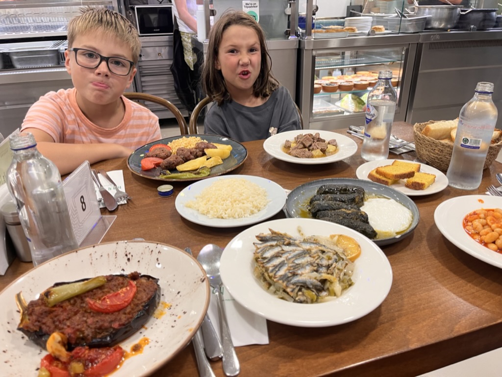 Le retour vers Beygolu en après midi fut ardu en raison des barrières de police partout, il a fallu contourner la place Taksim pour retourner à l’appart. On décide pour le souper d’aller au petit Kebab du coin, on s’assoit dehors à une table et on soupe avec les locaux. L’épicier jase avec le gars du kebab, il vient de s’acheter un genre de vélo électrique à 3 places et le fait essayer à ses voisins. Son fils d’environ 15 ans le conduit très bien et il offre de faire faire un tour aux enfants. Léo ne veut pas y aller, mais Margot oui; donc Julien et Margot embarquent et font un tour de bloc pendant qu’on attend notre bouffe. Très drôle! Le souper est très bon et littéralement à 2 minutes de l’appart. On y retournera.