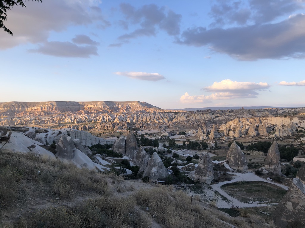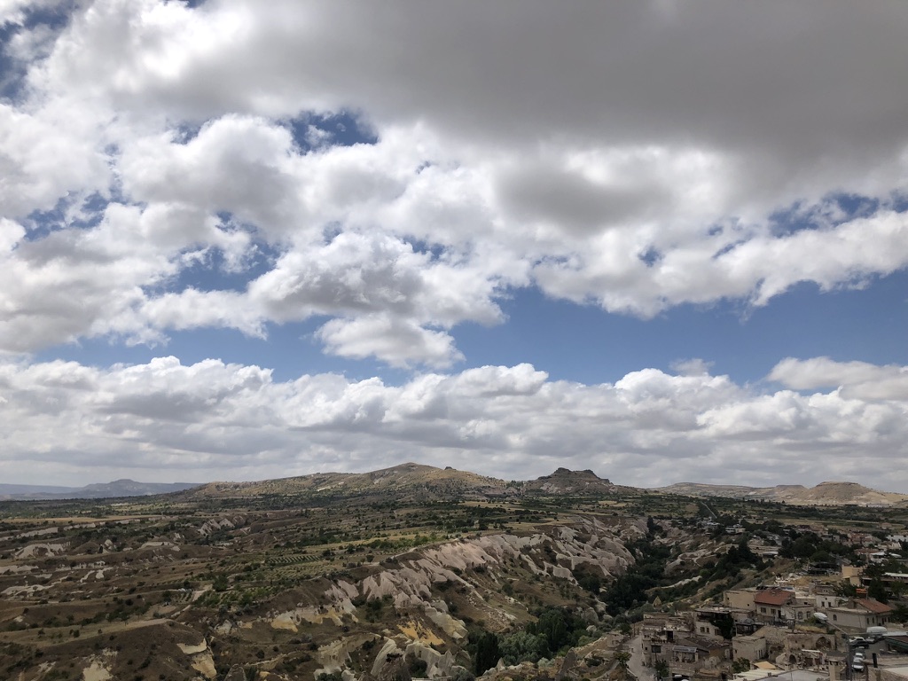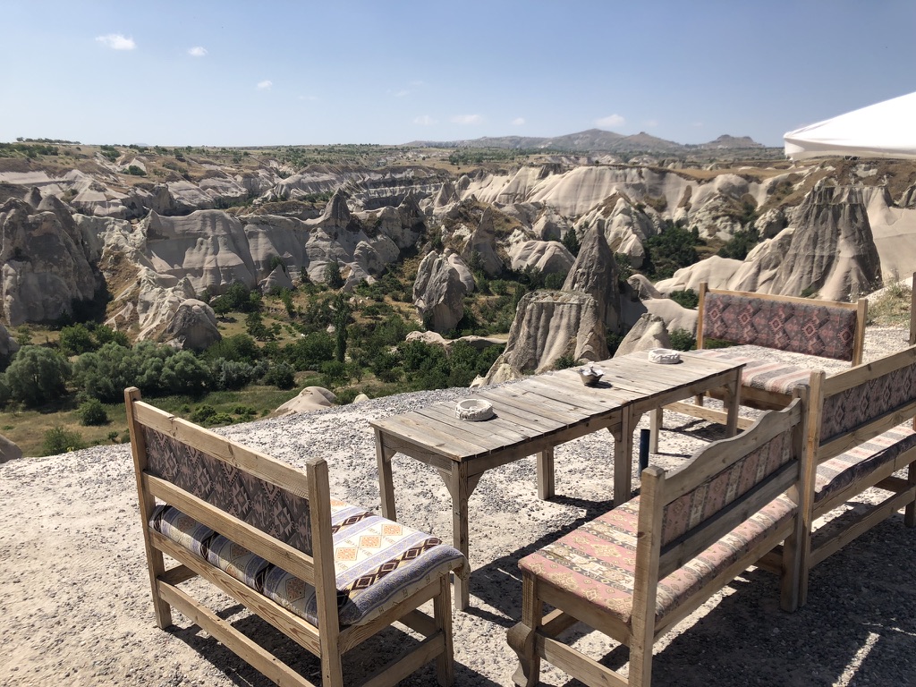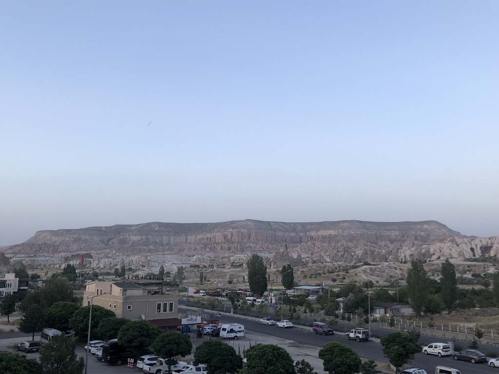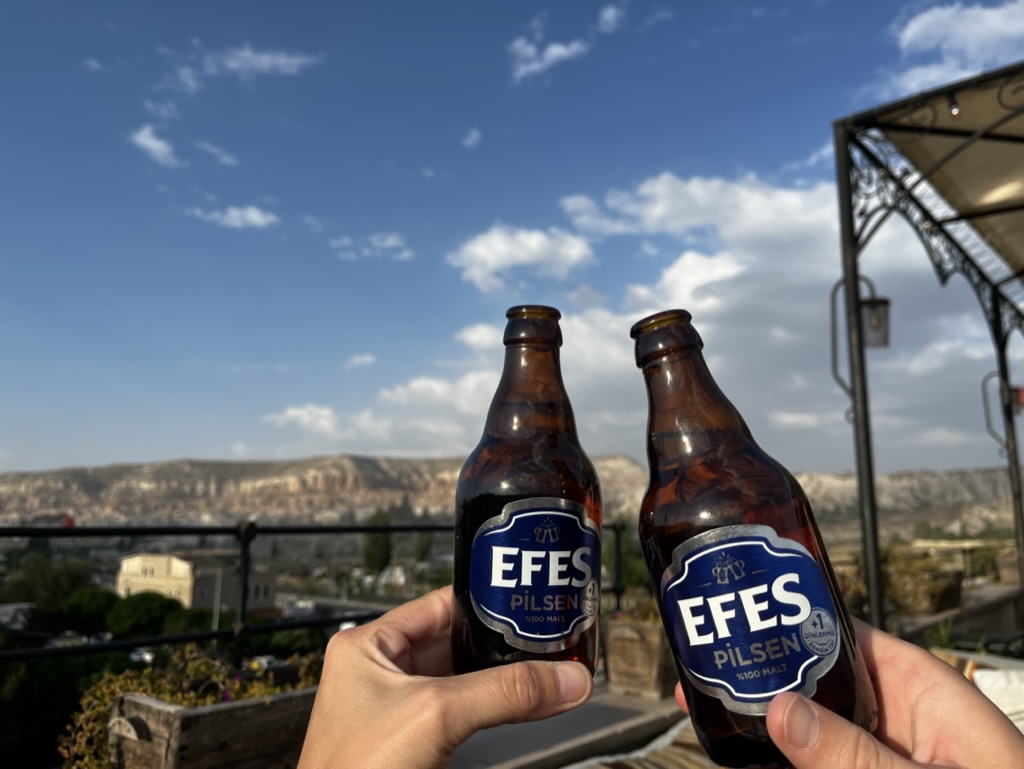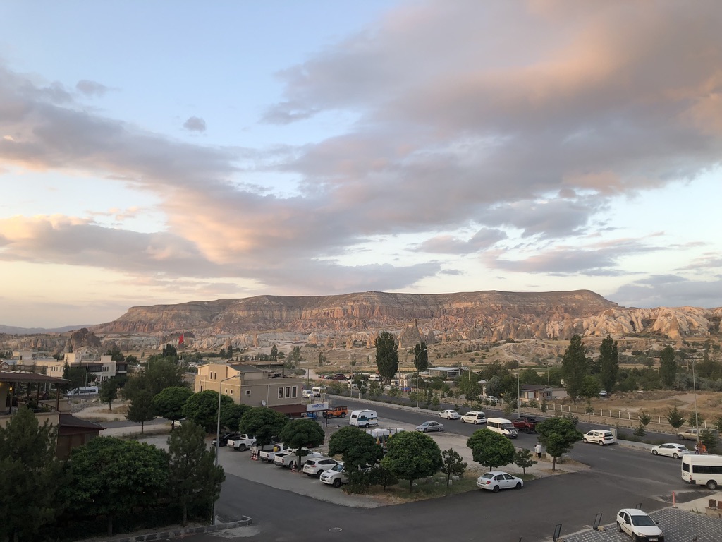 Malgré tout, nous avons pu profiter au maximum de chaque journée tel que vous pouvez l’observer dans les quelques photos sélectionnées. Donc, après un court vol d’environ 1h15 au départ d’Istanbul, ainsi que d’une heure de transfert depuis l’aéroport, nous sommes arrivés à notre charmant hôtel, le Caravanserai Inn. Après notre installation, on sort en fin de journée arpenter la rue principale de Göreme et prendre une boisson en terrasse tout en appréciant les vues magnifiques des montagnes à l’horizon.