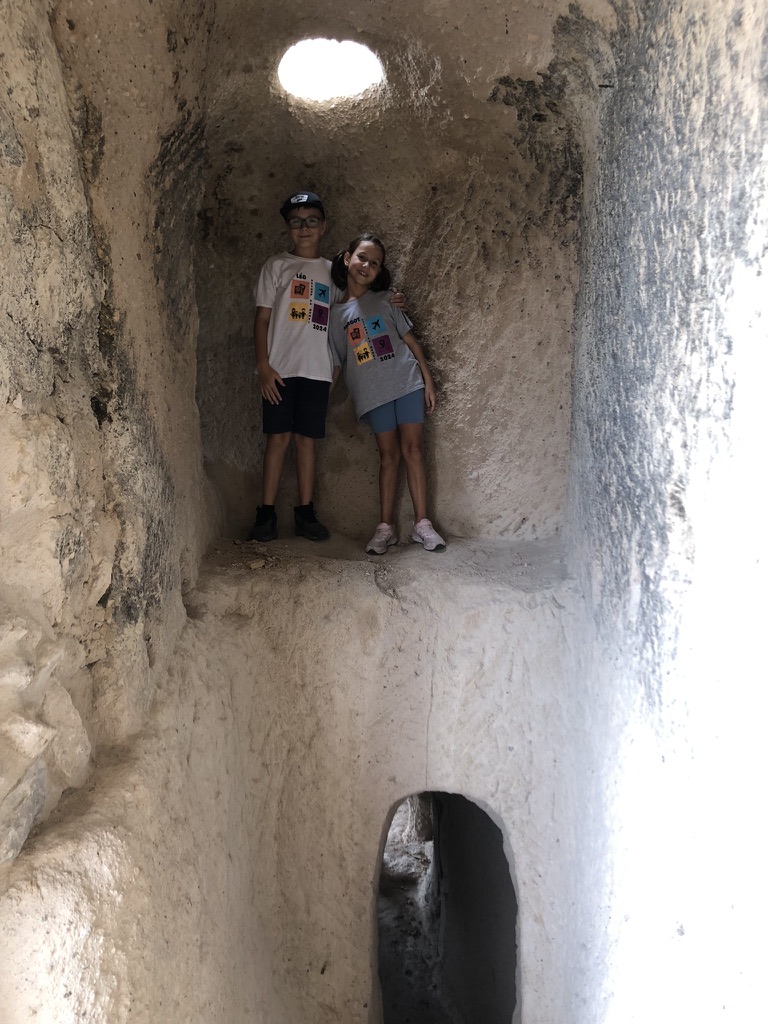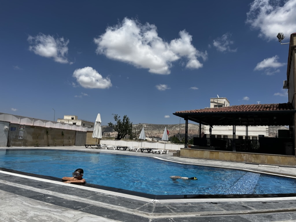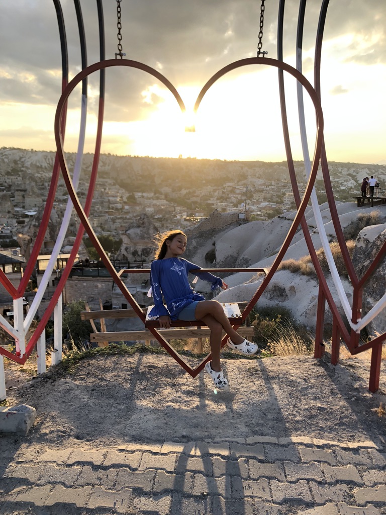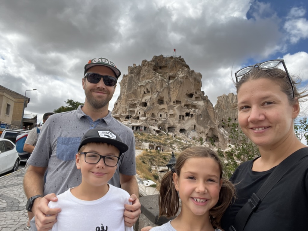 À notre 4e journée, Laurence et moi nous levons tôt pour aller sur la terrasse sur le toit de notre hôtel y observer les montgolfières, mais on constate la présence du vent, donc on retourne se coucher bredouille. Après un autre excellent déjeuner turc offert par l’hôtel, on saute dans un taxi pour aller faire la visite du château d’Uchisar. Encore une fois, les enfants adorent se promener dans les tunnels et se rendre au sommet pour observer les magnifiques paysages. En après-midi, on se rend dans un hôtel voisin pour profiter de sa piscine. L’eau y est plutôt frisquette et le vend n’aide pas la cause, mais on profite tout de même d’un beau moment de détente. En soirée, c’est notre dernière chance d’assister au coucher du soleil sur la montagne. Une fois rendus au sommet, on s’en veut presque d’avoir attendu à la dernière soirée pour s’y rendre. La vue y est absolument incroyable et le moment presque magique.